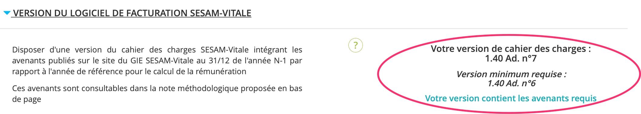 - De la version du cahier des charges SESAM-Vitale 1.40 addendum 6 ou supérieure (précédemment la version 1.40 2bis était exigée)ET- des avenants au cahier des charges suivants (les mêmes qu’en 2018), soit : l’avenant Tiers Payant ACS et l'avenant Tiers Payant ALD-MATERNITE